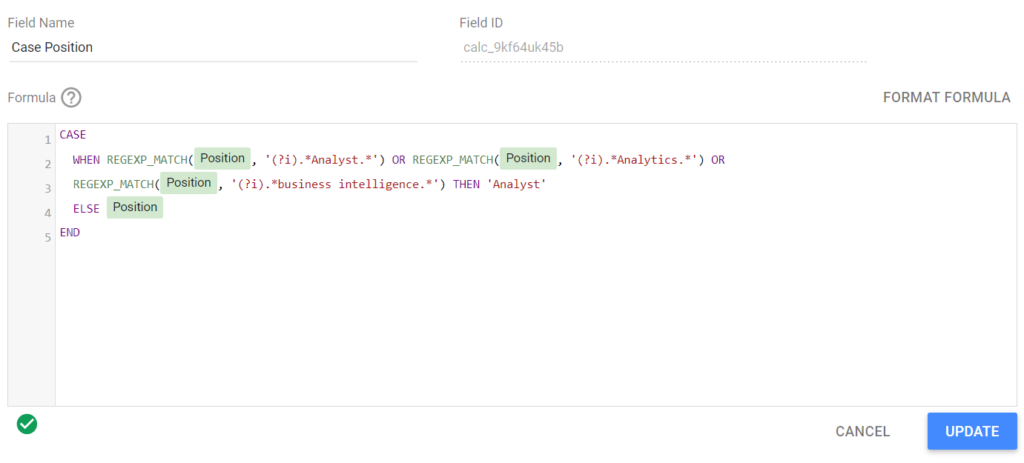 WHEN REGEXP_MATCH(Position,'(?i).*Analyst.*') or REGEXP_MATCH(Position,'(?i).*Analytics.*')