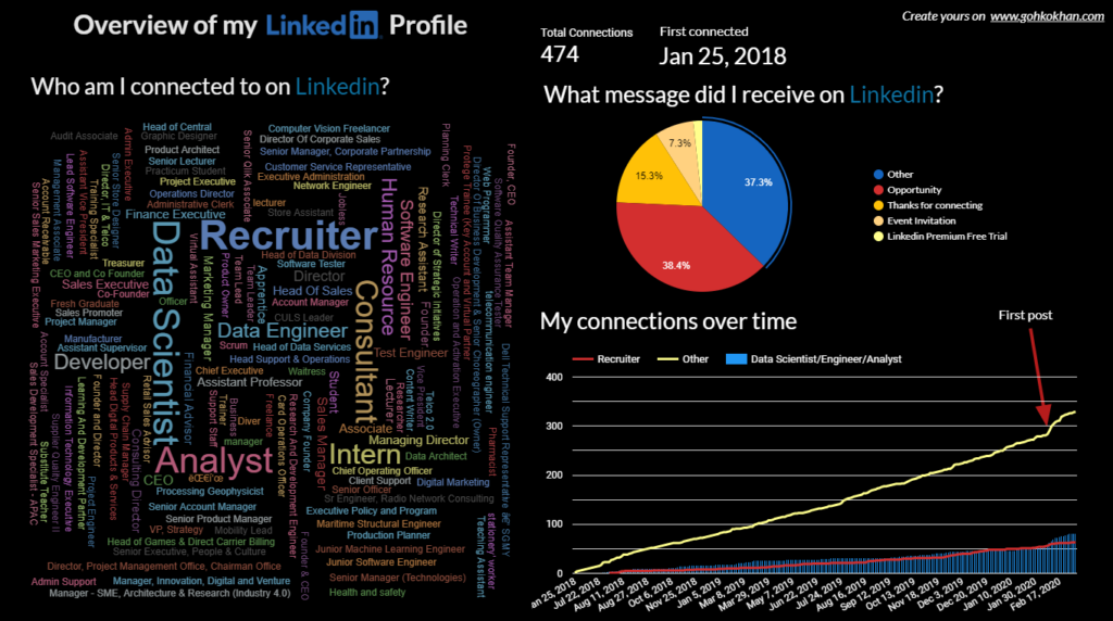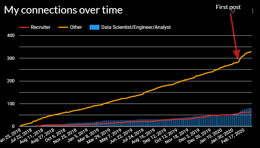 On the dashboard, I am surprised that many of my connections are coming from a Consultant background. Even though I am a Data Engineer, but there are more Data Scientists than Data Engineers on my Linkedin Connections. Being active on Linkedin gives me 3x more connections than usual.