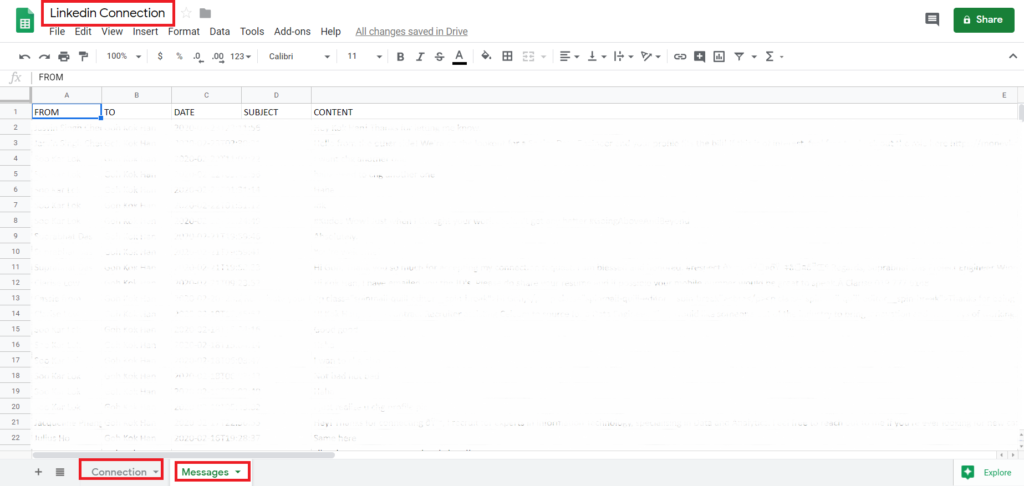 Create a Google sheets with the name Linkedin Connection, the first sheet is imported from the Connection, the second sheet is from the Messages. And you are ready to go!
